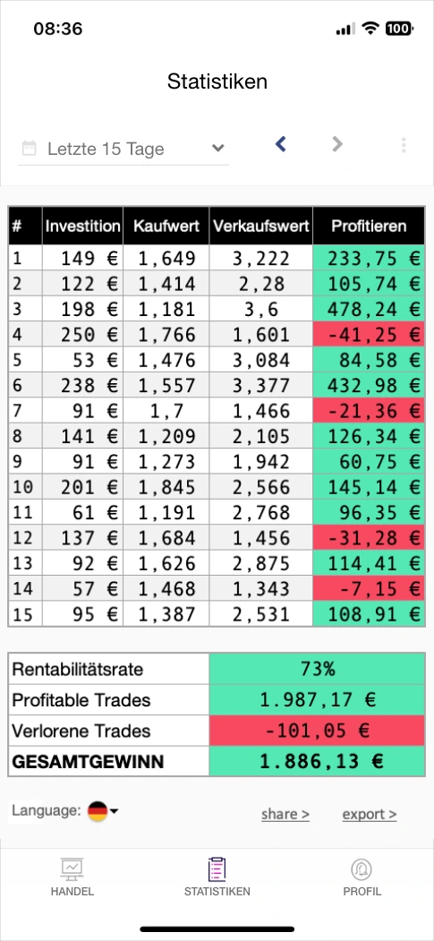 Ich habe vor etwa 2 Monaten angefangen diese App zu nutzen, als es noch eine Beta war und ich kann sie überaus weiterempfehlen, falls man das Glück hat, hier einzusteigen. Kann euch nur empfehlen, die Gewinne ab und zu abzuheben, weil ich sehe, dass manche Leute gierig werden. Sie investieren 500 $, verdreifachen den Betrag und investieren wieder alles, dann verdreifachen sie es wieder und legen es erneut an und so weiter, ohne jemals die Gewinne abzuheben. Ich lasse etwa 500-1000 $ im Anlagekonto und überweise all die anderen Gewinne jeden zweiten Tag.